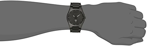 -. Feature : Gunmetal-tone watch in stainless steel featuring date window at 6 o'clock, three-link bracelet, and stick hour markers / Quartz movement with analog display / Protective mineral crystal dial window / Features deployant clasp closure / Water-resistant to 50 m (165 ft)