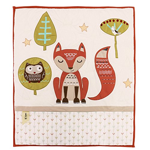 -. Feature : Clever Fox 4 Piece Set includes embroidered quilt, dust ruffle, fitted crib sheet, and diaper stacker; all fabrics are 100% jersey knit cotton, providing an especially soft feel for your baby / 100% jersey knit cotton fabrics will make the 30 by 40 inch quilt your baby's favorite tummy-time blanket; the intricate embroidered appliques provides interesting textures for her to explore / The fitted crib sheet, also of 100% cotton, has all-around elastic and deep pockets so that it will fit safely and securely every time to a standard 52 by 28 inch crib mattress / Extra-long crib skirt, featuring a full 17 inch drop, will assure that your crib looks fully "dressed" even when the mattress is at its highest setting; beautiful colors of tan and burnt orange are perfectly highlighted by a subtle blue and white P.R.Int / Beautiful modern design incorporates creative geometric patterns within the contemporary woodland creatures to yield a truly stunning look