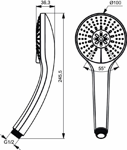 -. Feature : 3-Funktionshandbrause Ø100 mm (Strahlarten: Regen, Platzregen und Massagestrahl). / Anti-Kalk-Funktion. / Anschlussgewinde G1/2.
