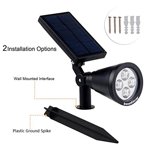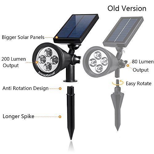 Description:Compared with the Old Version, the InnoGear Upgraded Version lengthen the stick to be inserted deeper into the ground and get more stable in bad weathers of rain, wind and snow; additionally, the Upgraded Version enhance the brightness up to 200 lumen from 80 lumen, by enlarging the solar panel and the battery capacity. It would be a better solution for landscaping your environment by illuminating flag, tree, garden, yard, pathway, etc.
