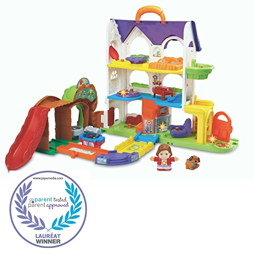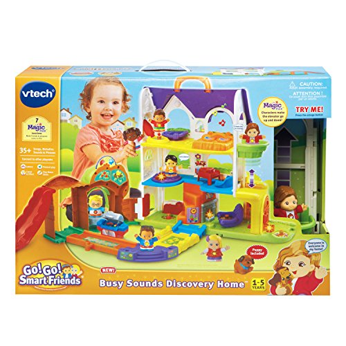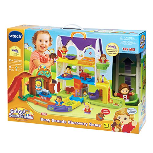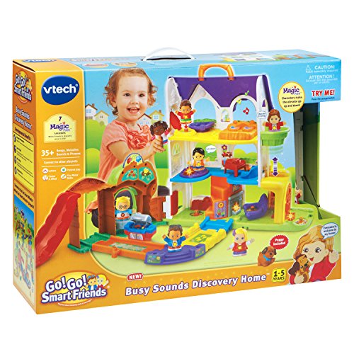 Explore the Go! Go! Smart Friends Busy Sounds Discovery Home by VTech with Miss Norah and her dog! The interactive house features seven MagicPoint locations that encourage imaginative play and emphasize cause and effect relationships. Simply place Miss Norah on one of the MagicPoint locations to experience her friendly personality, motion, lights and more. Put Miss Norah in the elevator and watch as the elevator magically moves up and down. Activate the MagicChat feature in the playroom, and hear Miss Norah and other Go! Go! Smart Friends characters (sold separately) chat and sing with each other. Miss Norah also responds to other MagicPoint locations on Go! Go! Smart Friends accessories and playsets (each sold separately). Press Miss Norah's light-up button, and she will come to life by introducing herself, sharing the things she likes to do and playing sing-along songs. Inspire the imagination and build an entire world by connecting to other Go! Go! Smart Friends, Go! Go! Smart Wheels and Go! Go! Smart Animals playsets (sold separately). Requires 2 AAA batteries (batteries included for demo purposes only; new batteries recommended for regular use). Intended for ages 1 to 5 years.Feature