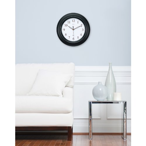 - Feature : Set & Forget Technology automatically adjusts for daylight savings time - no signal required / Black wall clock / Black numbers and decorative black hands / Convex Lens / 14" Diameter