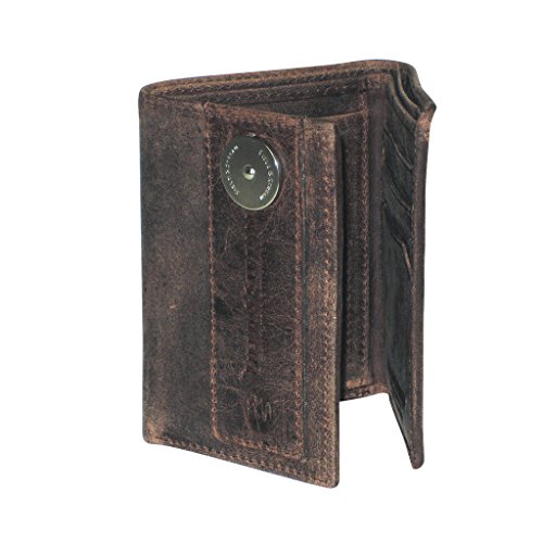 Product DescriptionOgden RFID collection in buffed distressed cowhide with nickel finish logo emblem three-fold0