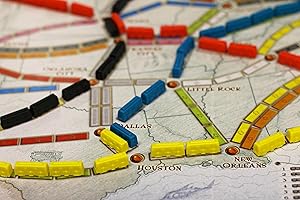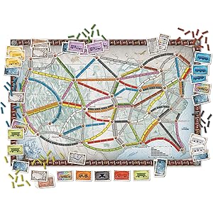October 2, 1900 - it's 28 years to the day that noted London eccentric, Phileas Fogg accepted and then won a bet that he could travel "Around the World in 80 Days." Now, at the dawn of the century, some old friends have gathered to celebrate Fogg's impetuous and lucrative gamble - and to propose a new wager of their own. The stakes: $1 million in a winner-takes-all competition. The objective: to see the most cities in North America - in just 7 days. Ticket to Ride is a cross-country train adventure game. Players collect train cards that enable them to claim railway routes connecting cities throughout North America. The longer the routes, the more points they earn. Additional points come to those who can fulfill their Destination Tickets by connecting two distant cities, and to the player who builds the longest continuous railway. For 2 to 5 players ages 8 and older. Playing time: 30-60 minutes. Comes with: 1 Board map of North American train routes, 240 Colored Train Cars, 110 Train Car cards, 30 Destination Tickets, 5 Wooden Scoring Markers, 1 Days of Wonder Online access number, and a Rules booklet.