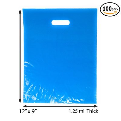 100 Pack 9" x 12" with 1.25 mil Thick Blue Merchandise Plastic Glossy Retail Bags | Die Cut Handles | Perfect for Shopping, Party Favors, Birthdays, Children Parties | Color Blue | 100% Recyclable