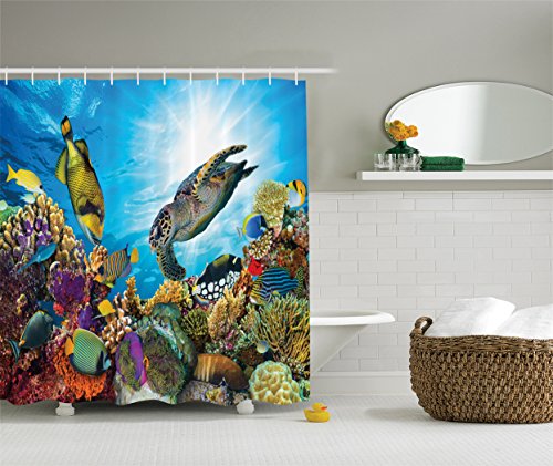 Ambesonne Ocean Decor Collection, Fishes and Old Turtle Hawksbill Floats under Water between Coral Reefs Aquatic Environment Picture, Polyester Fabric Bathroom Shower Curtain, 75 Inches Long,