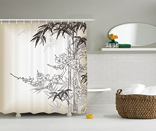 Ambesonne Japanese Bamboo Decor Collection, Abstract Tree and Bamboo Pattern Floral Leaf Design, Polyester Fabric Bathroom Shower Curtain Set with Hooks, Ecru Dark Olive