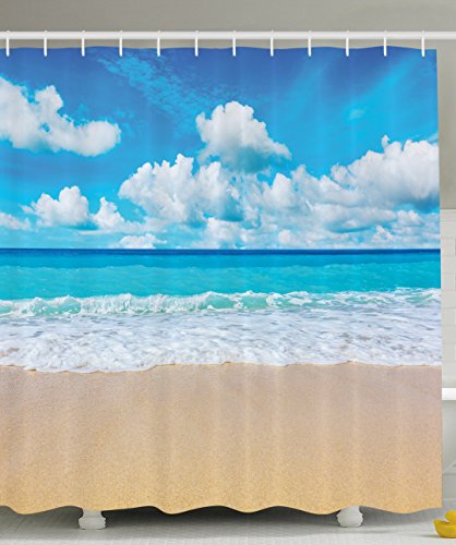 Ambesonne Tropical Coastal Contemporary Modern Decor Collection, Seascapes Seashore Ocean Paradise Beach Landscape, Polyester Fabric Bathroom Shower Curtain Set with Hooks, Blue White Beige
