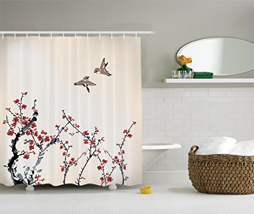 Ambesonne Watercolor Flowers Decor Collection, Spring Cherry Branches Blooms and Birds in Classic Design, Polyester Fabric Bathroom Shower Curtain Set with Hooks, Paprika Ivory