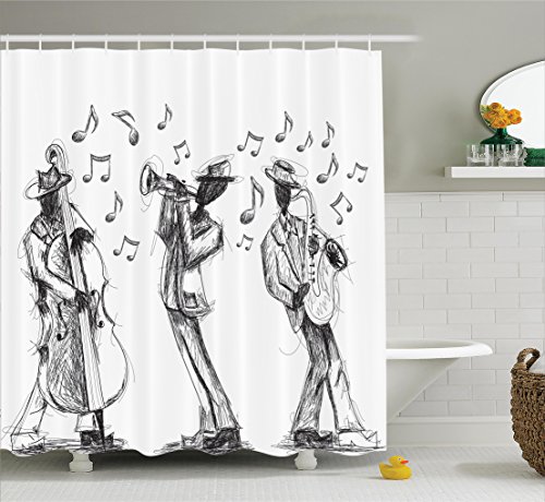 Ambesonne Jazz Music Decor Collection, Sketch Style of a Jazz Band Playing Music with Instruments and Musical Notes Print, Polyester Fabric Bathroom Shower Curtain Set with Hooks, Black White