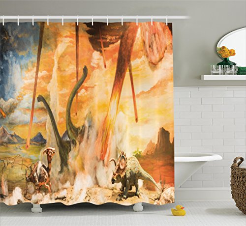Dinosaurs Shower Curtain Set by Ambesonne, Jurassic Dinosaurs Escaping Dying Big Meteorite Crash Heat and Fire Natural Disaster Scene, Fabric Bathroom Decor with Hooks, Orange Ivory