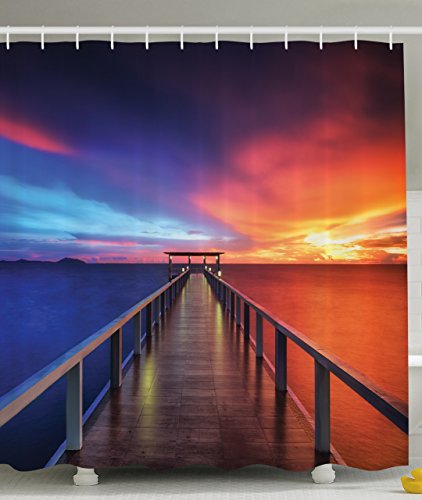 Ambesonne Giclee Bathroom Art Decor Collection, Beach Theme Seascapes Sunset Bridge Painting Pictures Phuket Lagoon, Polyester Fabric Bathroom Shower Curtain Set with Hooks, Blue Red Orange Brown