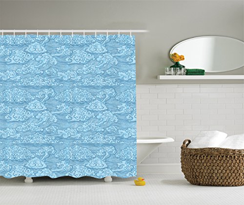 Ambesonne Blue Sky with Clouds Decor Collection, Ocean Waves Eastern Chinese Art Abstract Curls Stripes Design, Polyester Fabric Bathroom Shower Curtain Set with Hooks, 75 Inches Long, Blue Turquoise