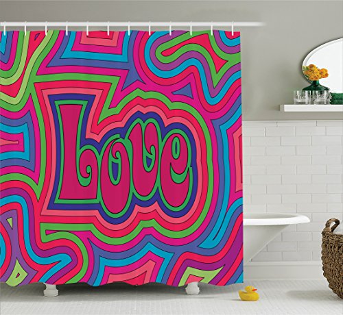 Ambesonne Groovy Decorations Collection, Groovy Psychedelic Love with Offset Swirls Cheerful Colors Festival Joyful Art, Polyester Fabric Bathroom Shower Curtain Set with Hooks, Blue Green Pink