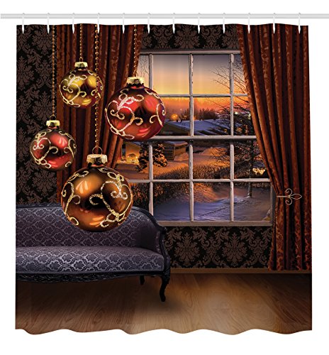 Ambesonne Christmas Decorations Collection, Christmas Balls Hanging front of Window View Snowy Street Holiday Season House Decor, Polyester Fabric Bathroom Shower Curtain Set, 75 Inches Long, Multi