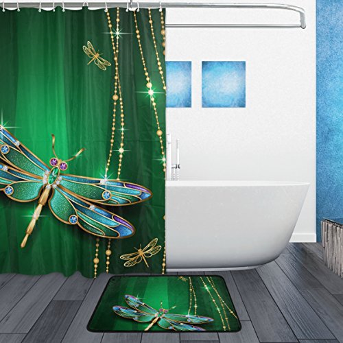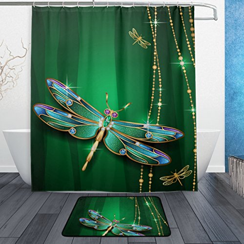 BAIHUISHOP Dragonfly 3-Piece Bathroom Set, Machine Washable for Everyday Use,Includes 60x72 Inch Waterproof Shower Curtain, 12 Shower Hooks and 1 Non-slip Bathroom Rug Carpet - Set of 3