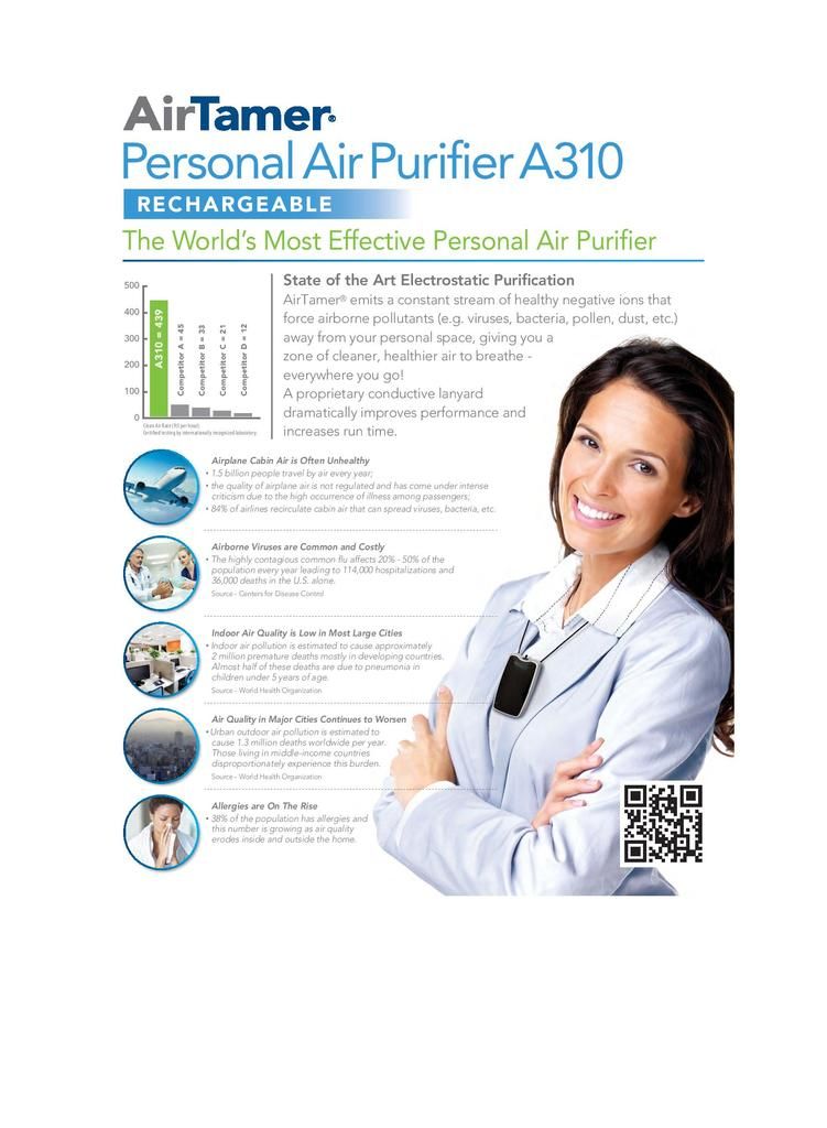 The AirTamer A310 is the world’s most effective personal rechargeable air purifier. AirTamer’s Advanced Ionic Technology emits a constant stream of healthy negative ions that force airborne pollutants away from your personal space giving you a zone of cleaner, healthier air.