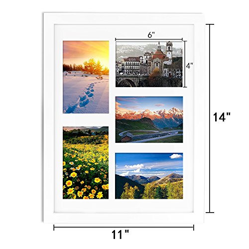 - Display five 4x6” in 11x14” picture frame: Show your favorite memories and vacations photos with friends, family (portraits & landscapes). Comes with easy opening tabs at the back for ease of access and to load pictures. The actual mat opening is 0.5 inch smaller, hold five 4x6 Inch pictures. We recommend taping the photo to the back of the mat in place.