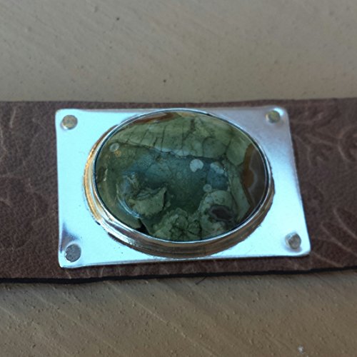 -. Title : 1' wide embossed leather cuff with bezel set Rainforest jasper