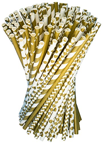 Gold Paper Straws Drinking Straw Individually Wrapped 7 Fun Patterns Baby Shower Weddings Parties; 100 Long Lasting Gold and White Paper Straws 100% Biodegradable