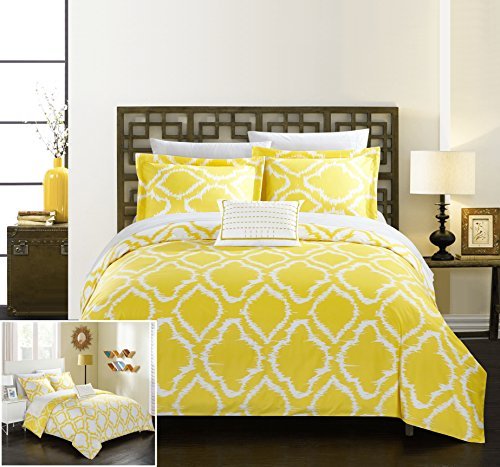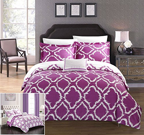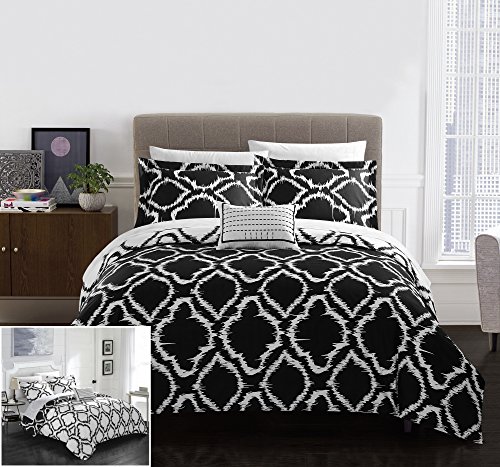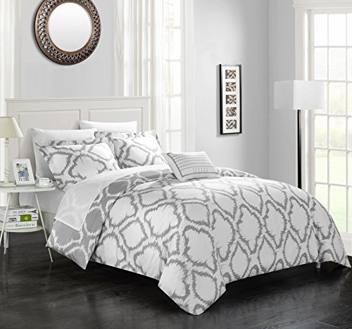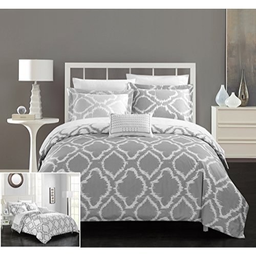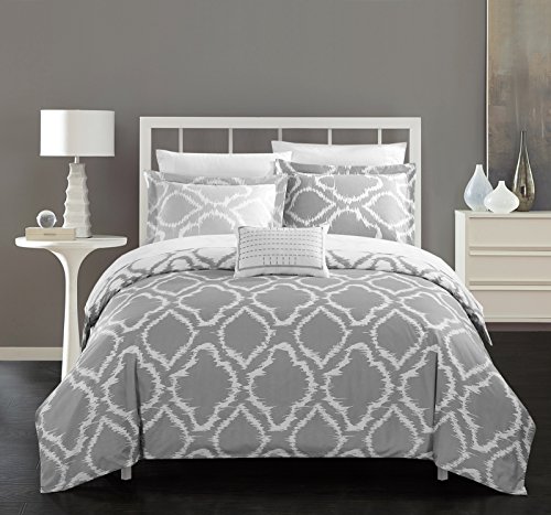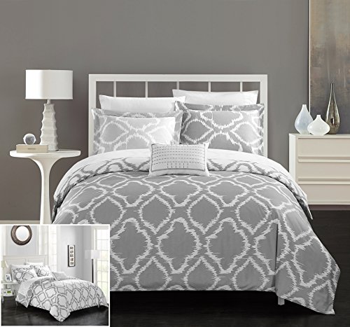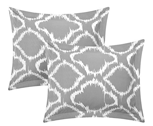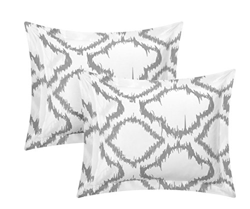 A designer inspired two-tone Ikat print bedding collection with everything you need for that chic trendy look. Reversible two-tone design features grey on white Ikat diamond print on one side and its inverse on the flip side. Included are a trendy reversible sham and an embroidered deco pillow to complete the look. Zipper closure for easy washing.