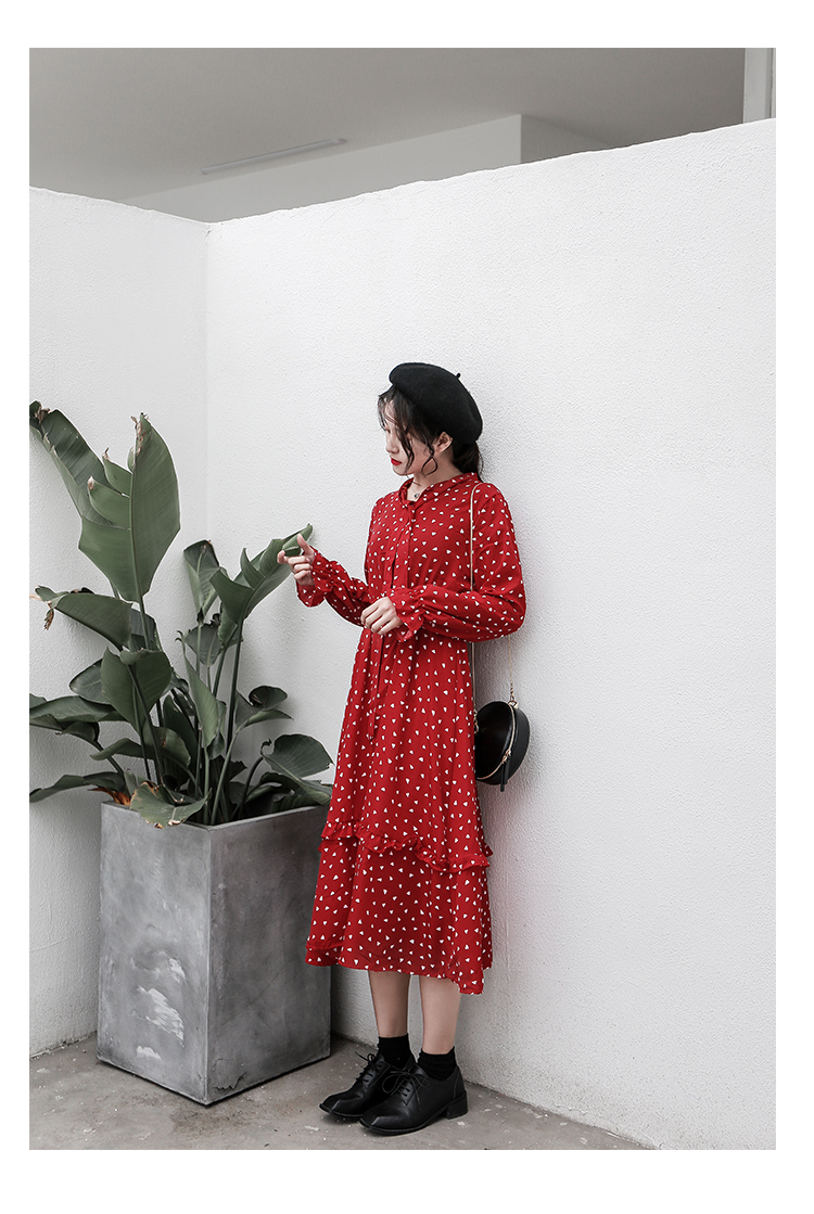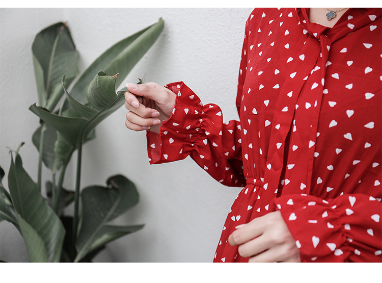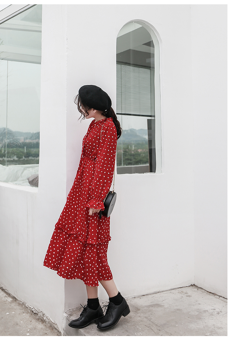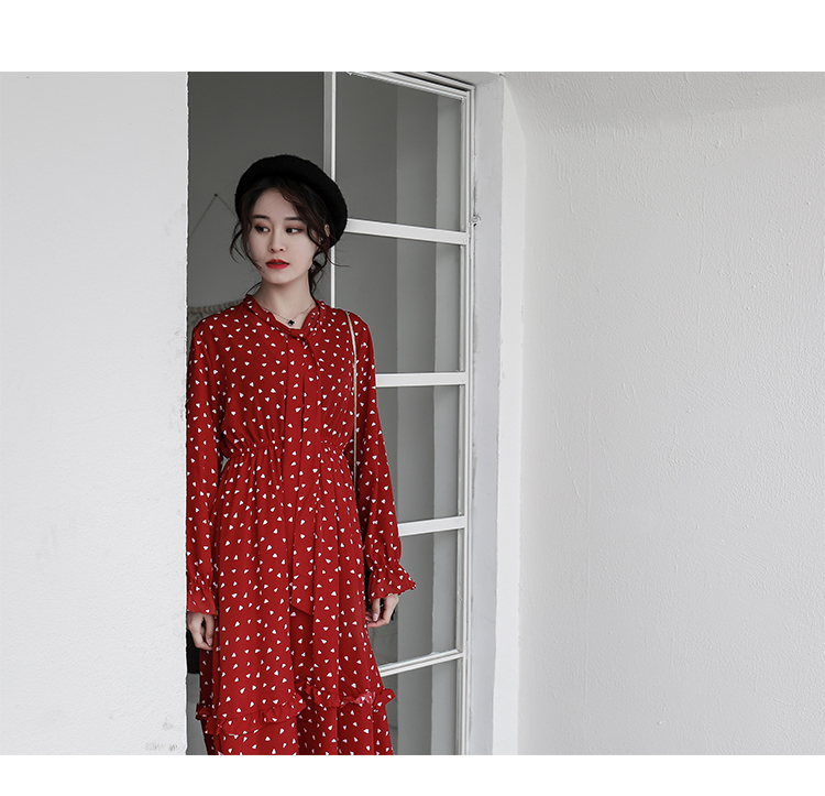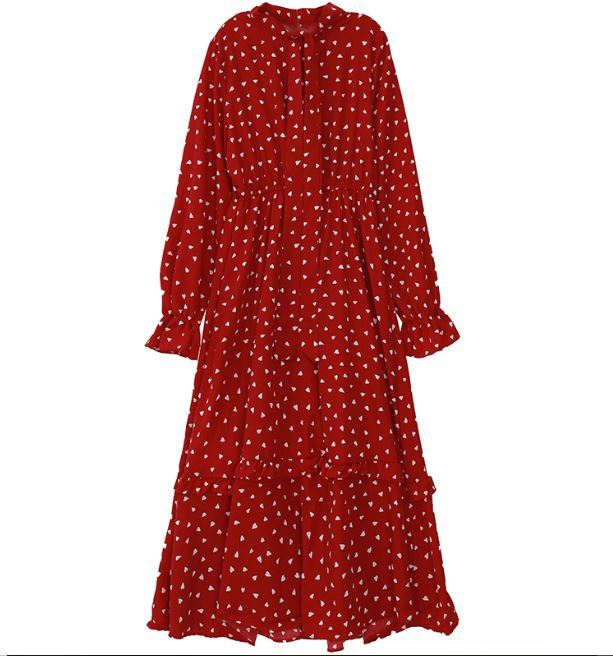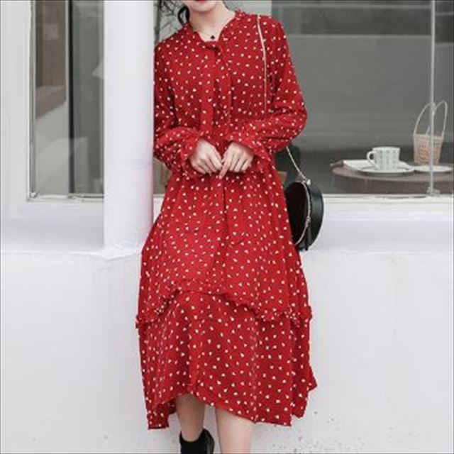 全体に散りばめられた小さなハート柄がキュートなロング丈ワンピースのご紹介です。