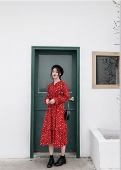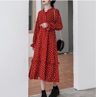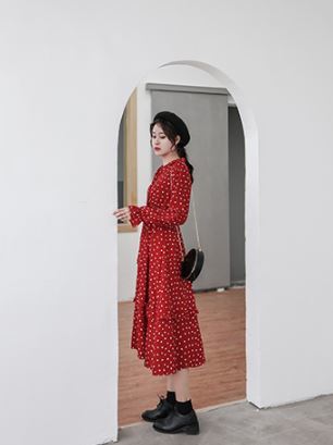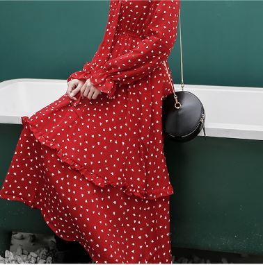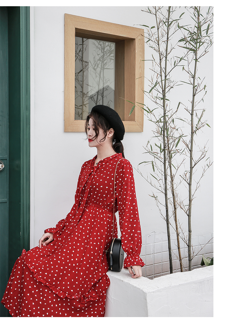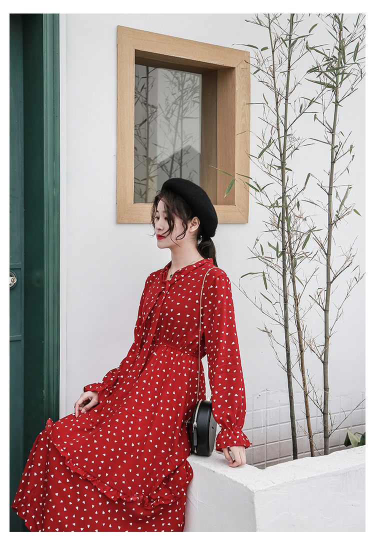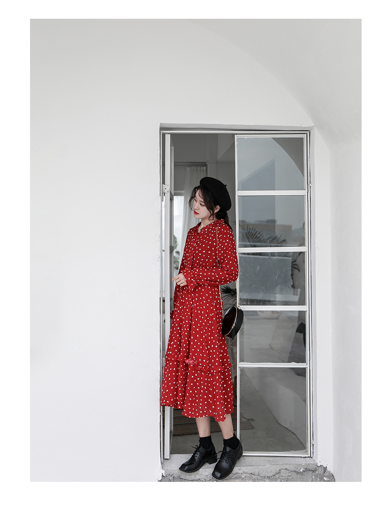 全体に散りばめられた小さなハート柄がキュートなロング丈ワンピースのご紹介です。