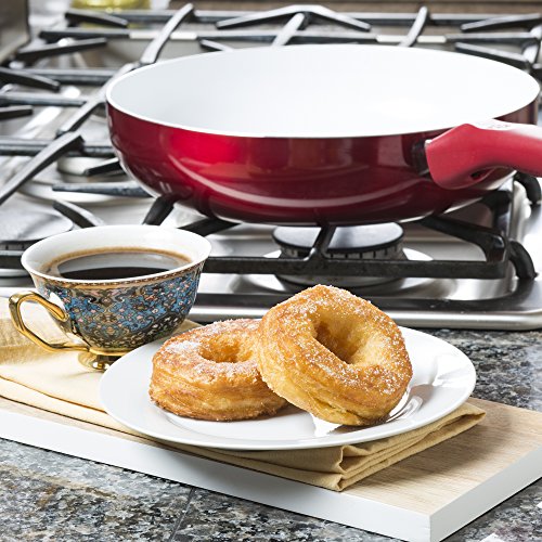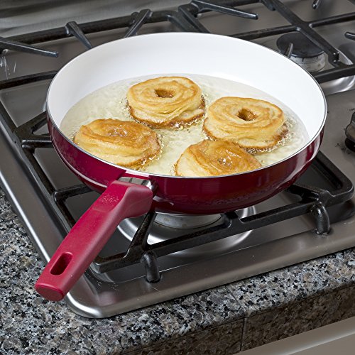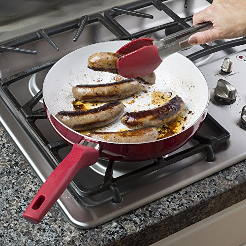 Tempered glass lid with steam vent and elevated lift handle. Ergonomic silicone handle is comfortable and stays cool.
