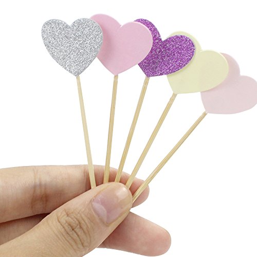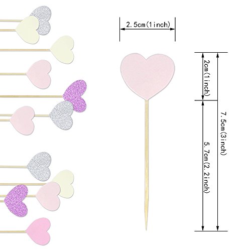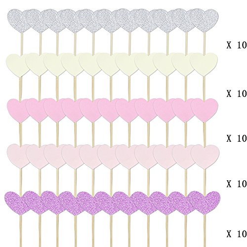 Binding : Toy Product Description Set of 50 Cupcake Toppers in 5 Assorted Light Colors. Whole Size: 2.5x7.5cm/1*3 inch Stick Length: 5.7cm/2.2 inch Heart Size: 2.3*1.7cm/0.9*0.67 inch 5 Colors: light yellow, light pink, pink, glittering pink, glittering silver. Package includes: 10 * light pink heart topper 10 * pink heart topper 10 * light yellow heart topper 10 * glittering pink heart topper 10 * glittering silver heart topper Our toppers are versatile as they can be used for cake decorations, cupcake decorations, muffin decorations, or dish, bakery decorations, etc. Set of 50 is enough quantity for parties, birthday, graduations, weddings with pink shades to add more atmosphere. The pink shades are popular with kids or girls and perfect for weddings. Add to cart now! Note: Made from stick and cardboard, so please don't put them in ovens. 0