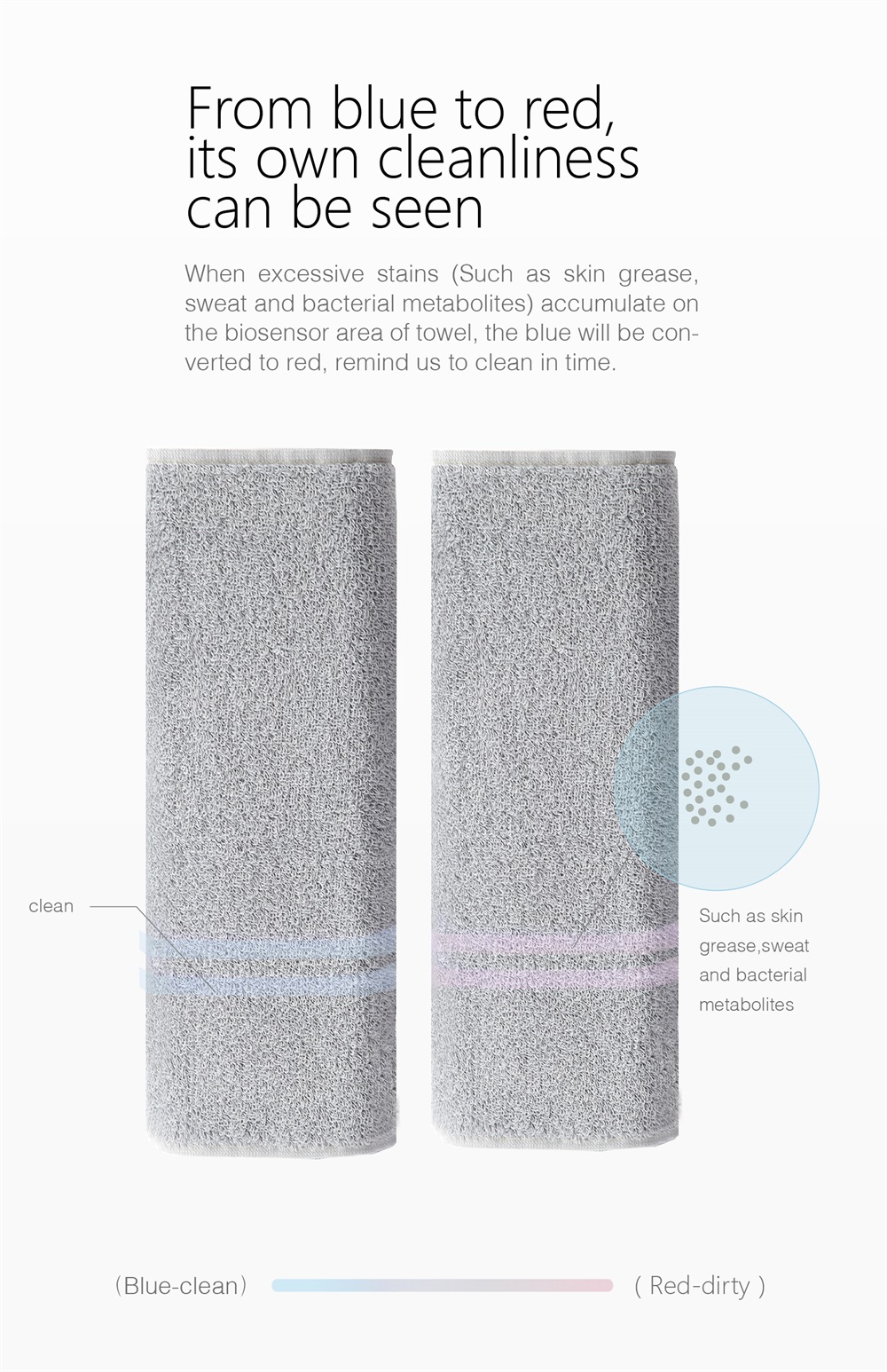 Once the towel get uncleanness such as grease, sweat, or bacterial metabolites, the remind line will turn into red.