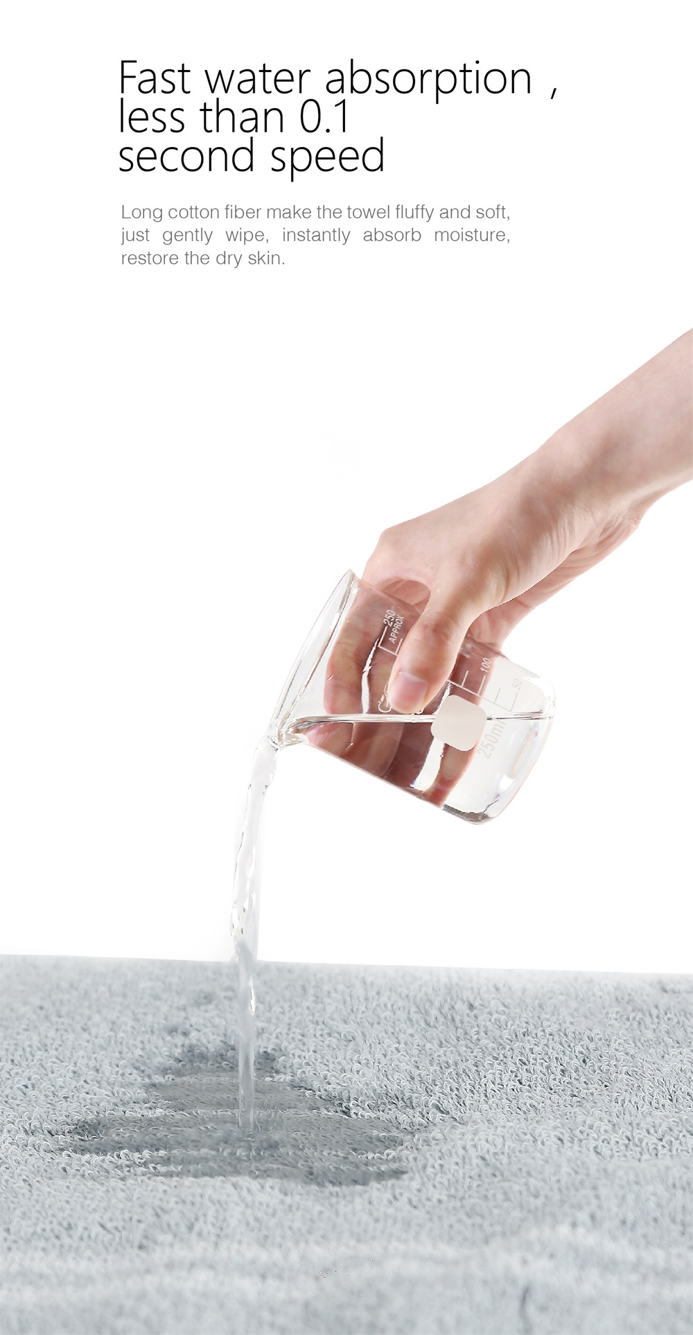 100% COTTON FABRIC which comes from pure plant extraction with an incredible speed on water absorption, every single piece sucks in water molecule for about 1 sec.