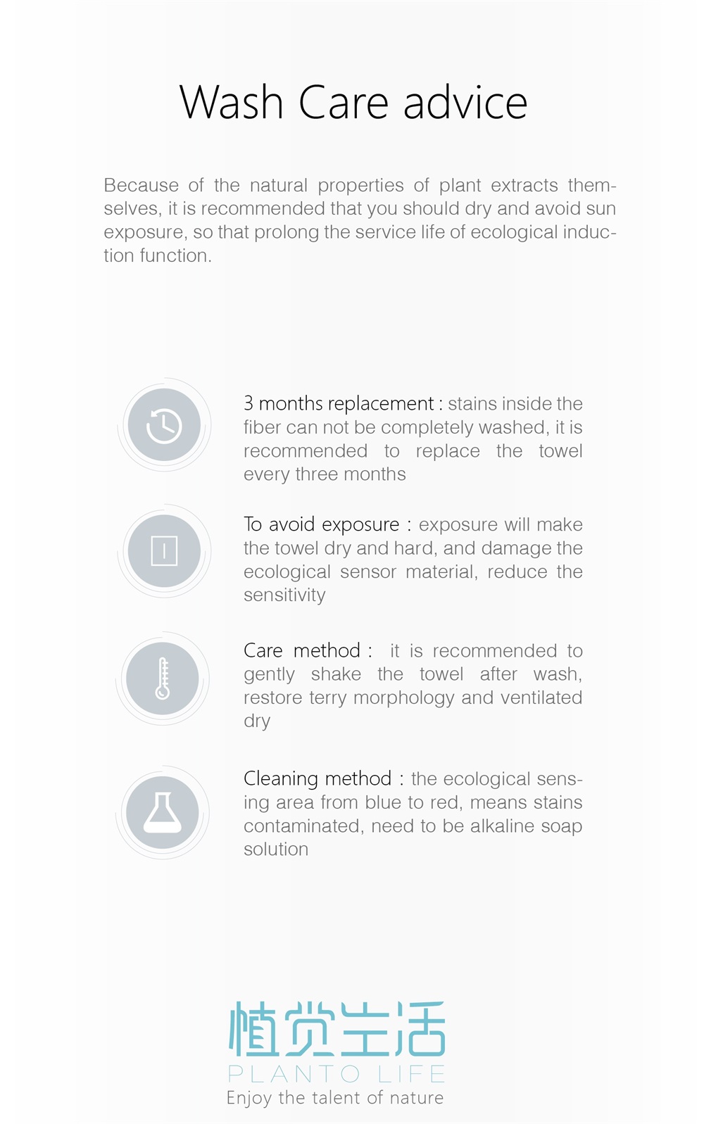 ECOLOGICAL SENSOR ON POLLUTION as an intellectual concept, we combined natural extraction with cutting-edged compound technology, on which you can see that there’s a reminder line on every single towel to alarm you that it’s time to get washed up.