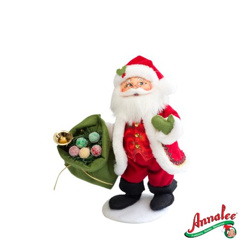 - Annalee's Christmas Delights Santa is sure to be an elegant addition to your decor this holiday season! Dressed in a red Santa suit with white fur trim and ric rac detail, gold buttons and black boots, he carries a green bag of sugared fruits. Pair with Annalee's Christmas Delights Mrs. Santa for a smartly dressed couple!