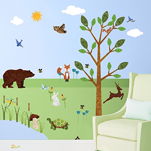 - A COMPLETE SET OF FOREST WALL DECALS FOR YOUR WOODLAND ANIMALS OR NATURE THEMED BABY NURSERY OR KIDS’ ROOM: Fill the walls of your forest room with these delightful nature inspired wall graphics. The full kit is filled with 37 large decals including: large tree, bear, fox, turtle, rabbit, owl, birds, deer, squirrel, butterfly, dragonfly, bees, clouds, sun, worm, toadstool, snail, cattails, grass clumps, and various flowers.