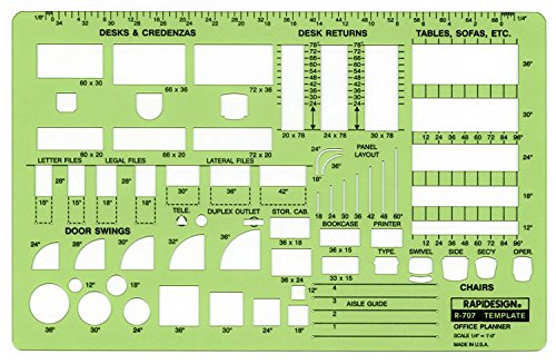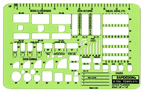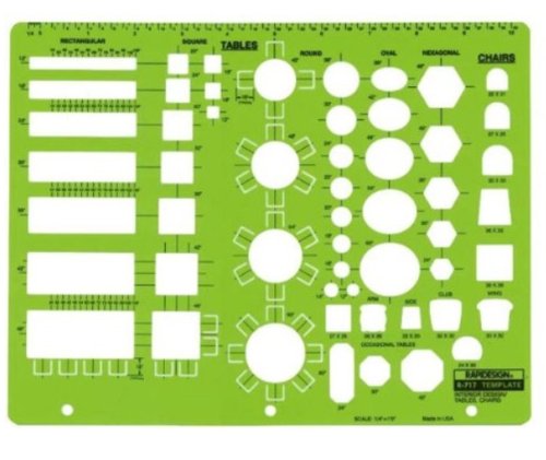 Rapidesign 1/8 Inch Banquet/Seminar Planner Template (#R709) is great for planning banquet, seminar or conference room layouts. Includes tables, chairs, door swings, podium, projector stand, TV, etc. Table pre-spacing is provided for quick and accurate arrangements. 1/8 inch = 1'. Made in USA. Rapidesign has the world's largest selection of drafting templates for architects, builders, engineers and graphic designers.Feature