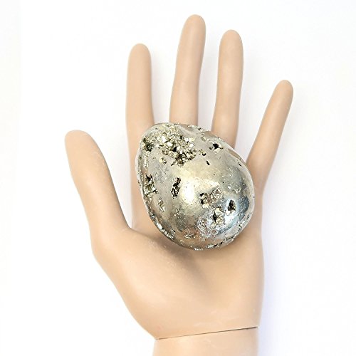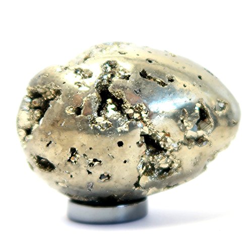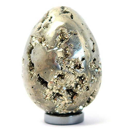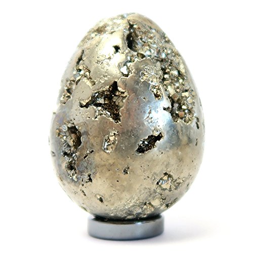 One-of-Kind: Natural Pyrite is polished into your new crystal healing egg. Pyrite is popularly known as Fools Gold for its golden metallic color. The weighty Iron Ore forms in brilliant clusters and perfect cube crystals. This Pyrite has been polished into an egg-shaped stone displaying glittering craters of crystal cubes. The unique Pyrite egg can be displayed on the included metallic black Hematine ring stand.