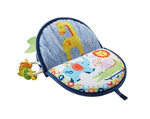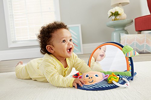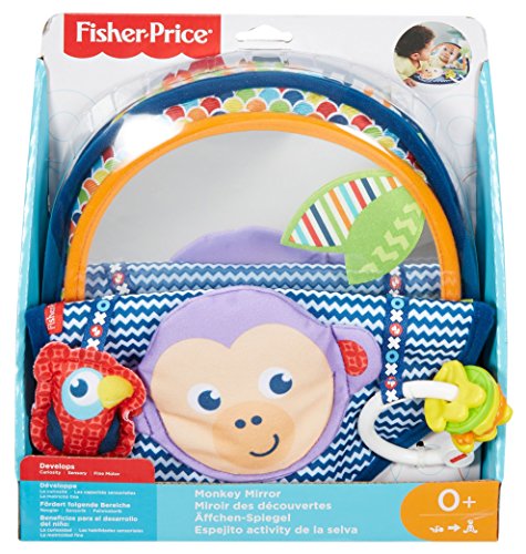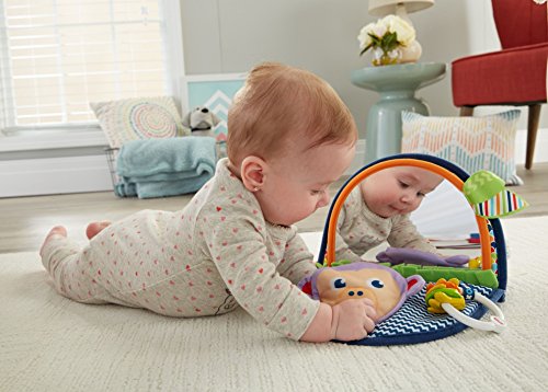 -. Feature : Monkey see, monkey do / Large mirror, at just the right angle for tummy time, encourages self-discovery / Lots of sensory-stimulating activities, including: crinkle panel within easy reach monkey squeaker parrot jingle banana clackers tactile fleece grass