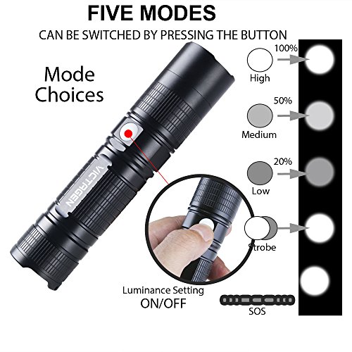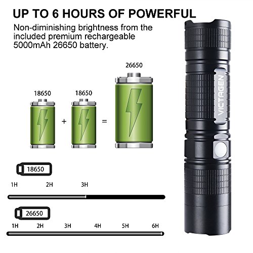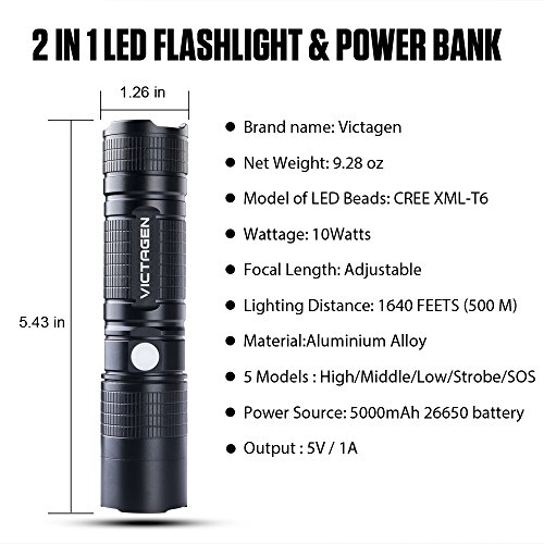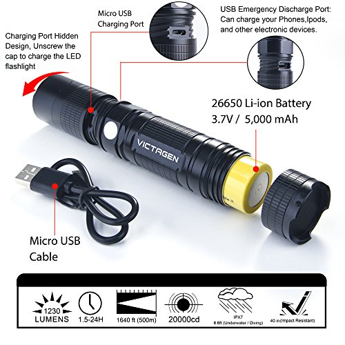 Victagen Tactical LED Flashlight 1230 Lumen Portable Ultra Bright IP67-Waterproof Micro-usb charge Torch & Power Bank Rechargeable 26650 5000mAh Battery Adjustable 5 Modes for Hiking Camping
