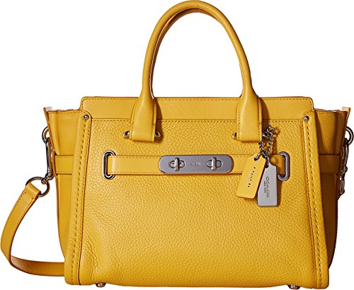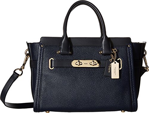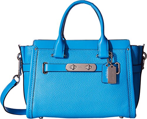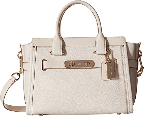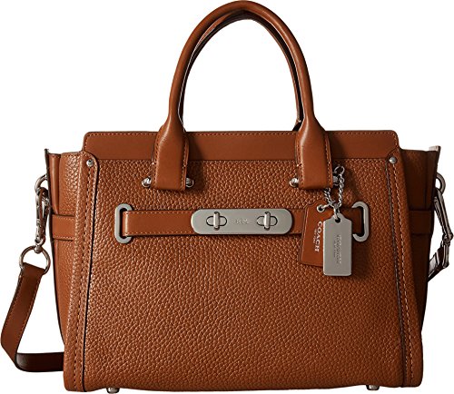 This charmingly compact version of the Coach Swagger carryall is crafted in pebble leather with a refined grain. The long strap snaps on with ease for a hands-free carry; statement belting and double-turnlock hardware provide the swagger. Pebble leather Inside zip, cell phone and multifunction pockets Zip-top closure, fabric lining Handles with 4" drop Longer strap with 19" drop for shoulder wear 10 3/4" (L) x 7 3/4" (H) x 5 3/4" (W)