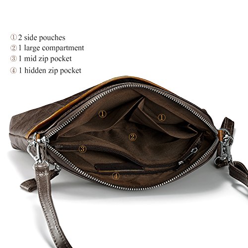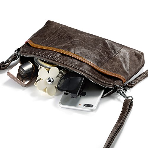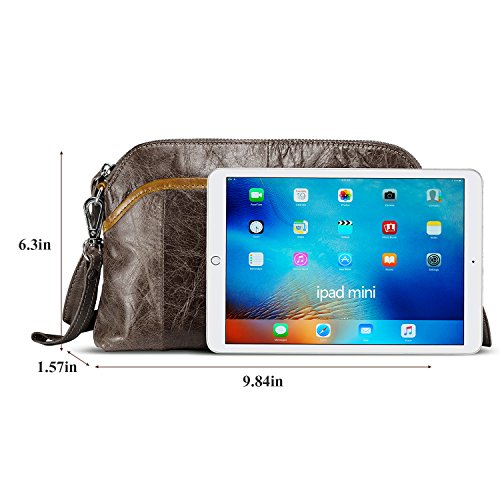 -. Feature : ✔ Versatile wearing styles, wristlet clutch & crossbody bag & small shoulder purse / ✔ [Soft vintage leather]: Made by genuine cowhide leather with oiling and waxing finished, premium polyester lining, smooth, soft hand touching / ✔ [Multi-function]: 1 front quick access pouch, 1 rear zip pocket, 1 large compartment(1 hidden zip pouch, 1 mid zip pocket, 2 side pouches), can hold smartphones, charger, small makeup necessities, tissue, perfume, chapsticks, etc / ✔ Smooth Silver tone hardware, heavy duty, no rust, classy / ✔ Dimensions: 9.84"(L)x 1.57"(W)x 6.3"(H), NOT for iPad or any other tablet editions.