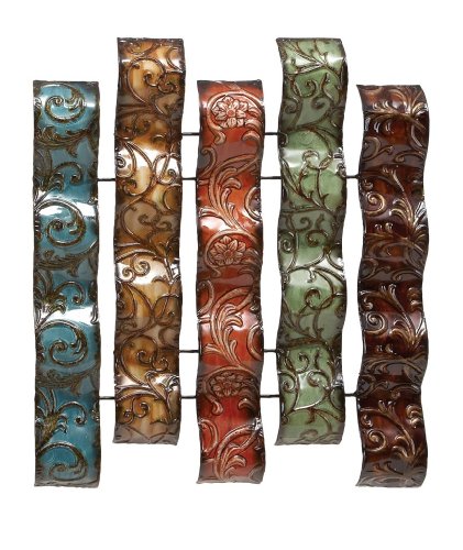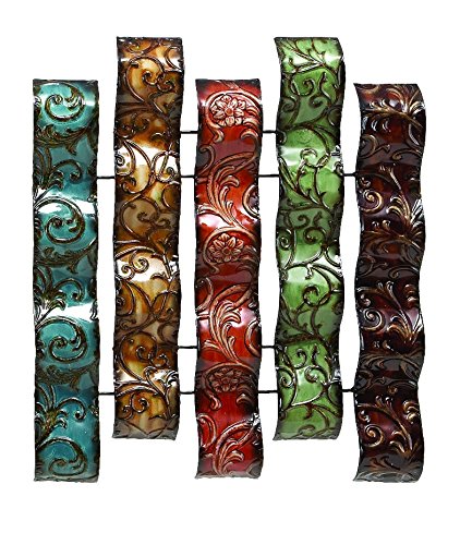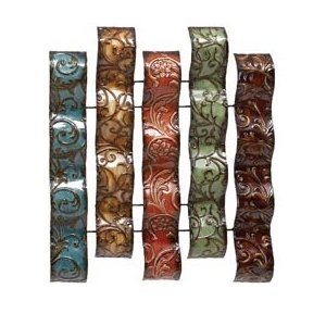 Item description: 24" updated traditional blue, brown, red and green patina iron embossed botanical design vertical waved strips wall sculpture on metal frame.