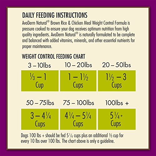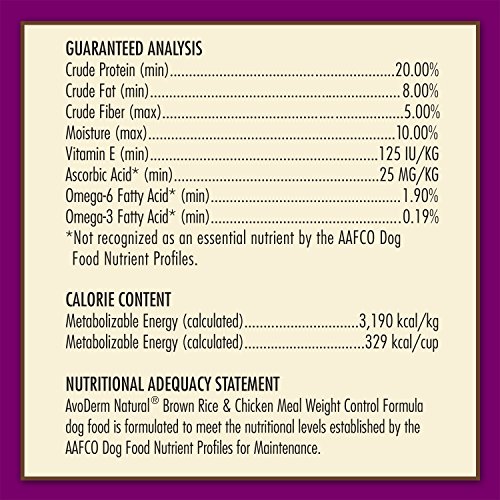 Keeping your dog healthy also includes maintaining a healthy weight. AvoDerm Natural Brown Rice & Chicken Meal Weight Control dry dog food provides the necessary ingredients to keep your dog healthy and happy while helping them lose weight. Our secret? Simple, the weight management recipe contains 25% less fat than our leading AvoDerm Natural Chicken Meal & Brown Rice adult dog food while maintaining the winning flavor. All the same great taste, with less fat, is our winning formula to promote healthy weight and lifestyle. Serve up our Chicken Meal Weight Management adult dog food and see the results.