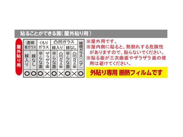 | 今まで熱で割れる恐れがあって貼れなかった鉄線の入った網入りガラス、複層(ペア)ガラスに貼れる外貼り用の断熱フィルムです。日光の熱を鏡のように反射し、冬は室温を保ちます。マジックミラー効果で視線をカット!ガラスが割れても飛び散りません。キズがつきにくく、窓拭きなどでのお手入れも簡単。有害なUV(紫外線)を99%以上カット。尚UVカットは全面貼りした時に最大限の能力を発揮します。 |