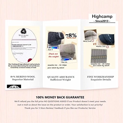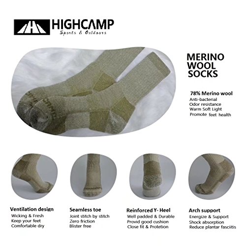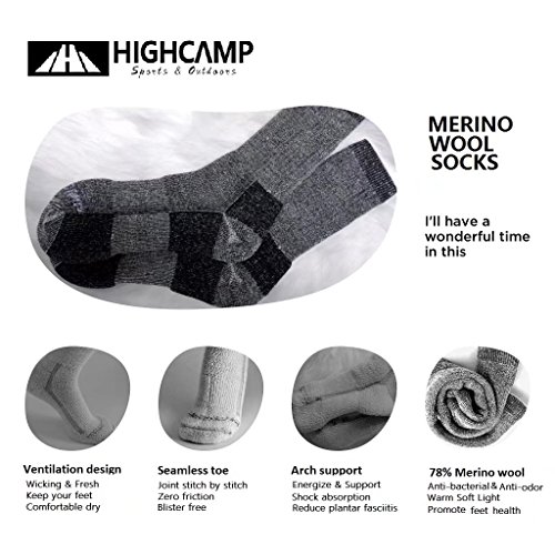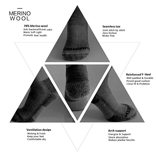 -. Feature : MERINO WOOL SOCKS : Upto 78% Merino Wool, guarantees Super Soft, Warm and Breathable. All day Dry and Comfortable. Germ Free, Fungus Free, Stink Free! / CUSHION BOOT SOCKS: Fully cushioned with High & Low compression based on Human Physical Dynamic, designed to Compress for Supportive, Protective and trap the heat / ANTI- BACTERIAL WICKING SOCKS: Ventilation Channel at foot both side for natural removal of Moisture before your feet sweets, keep fresh all the time no more sweaty or smelly feet! / PERFORMANCE HIKING SOCKS: Seamless Toe Closure, Supported Arch Brace, Y- type Heel Tab, Stay up Cuff, No abrasive, No blisters, No bunching & slipping! / CYCLING RUNNING CREW SOCKS: Ready for every Indoor & Outdoor use, A warming gift to warm your beloved ones, also can be an amazing winter wear investment for yourself