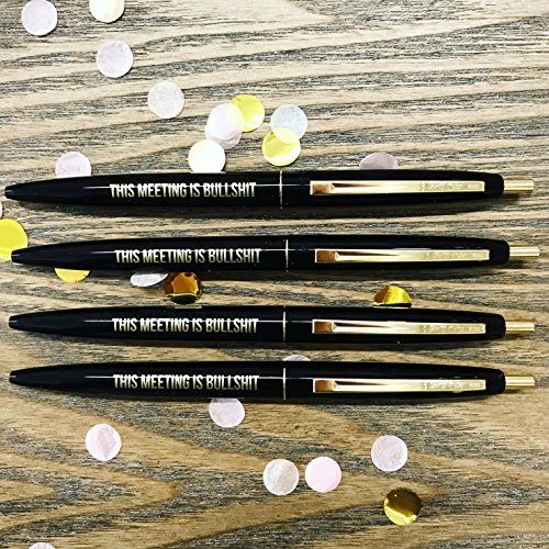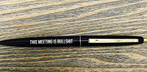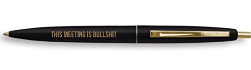 -. Binding : Office Product -. Brand : Get Bullish -. Feature : This Meeting is Bullshit Black and Gold Pen / Genuine Bic Clic Pen / Takes standard Bic refills / Black ink / Gold clip attaches pen to your paperwork or pocket -. Label : Get Bullish -. Manufacturer : Get Bullish -. MPN : 00856818006495 -. PartNumber : 00856818006495 -. ProductGroup : Office Product -. ProductTypeName : WRITING_INSTRUMENT -. Publisher : Get Bullish -. Studio : Get Bullish -. Title : This Meeting is Bullshit Pen in Black and Gold