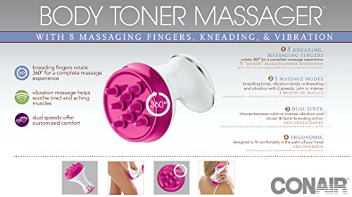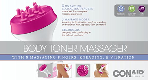 ReleaseDate : 2015-06-22 Studio : Conair Publisher : Conair Binding : Health and Beauty Product Description The Conair Body Toner Massager gives you a complete massage experience right in the comfort of your own home. 8 Kneading, massaging fingers rotate a full 360-degrees for a complete and rejuvenating massage experience. The 3 massage modes and dual speed settings offer customized comfort. Choose from, kneading (only), vibration (only), or kneading and vibration. Also, choose between calm or intense vibration and slower and faster kneading action. This body toner massager is ergonomically designed to fit comfortably in the palm of your hand. 3 AA batteries required (not included). 0
