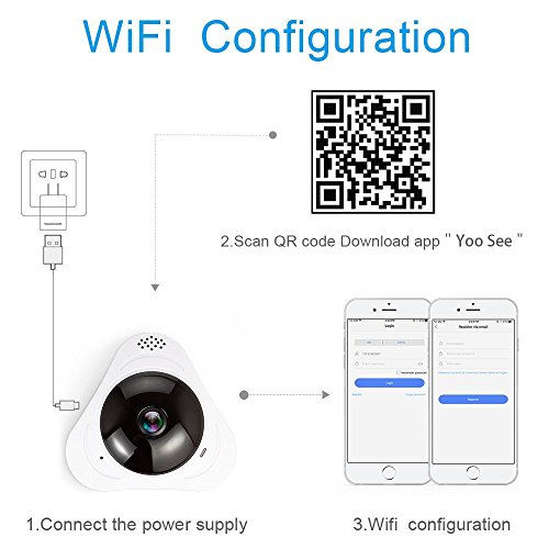 -. Feature : 【Easy to Use-Sonic Wave Connection】Just need one step to connect your camera,enter your wifi and password,and then the phone to send a sonic wave,you just need to wait the camera connection your wifi. / 【Fish Eye Panoramic Review】360 degree fisheye Wi-Fi IP camera without blind spots.See the entire room in stunning HD video quality during the day or at night(with Night Vision).HD 960P Video format:1280*960P(1.3MP) / 【Motion Detection】Get informed about every movement in your house, The motion detection sensors 'feel' it when something is moving in the room and will let you know immediately. It will take a picture and push a message on your phone. Perfect for surveillance! / Mobile Devices and NOTES】 Record, store and review footage using a Micro SD card(Minimum support 8G, Maximum 128G) and manage directly from your mobile device; Alert pictures will be stored on the SD card, and you can playback the videos on your phone. Loop recording: When the memory full, it will auto cover the oldest video files. / 【IR Night Vision】Night vision up to 30feet - Never miss a moment, day or night, with visibility up to 30 feet in complete darkness.