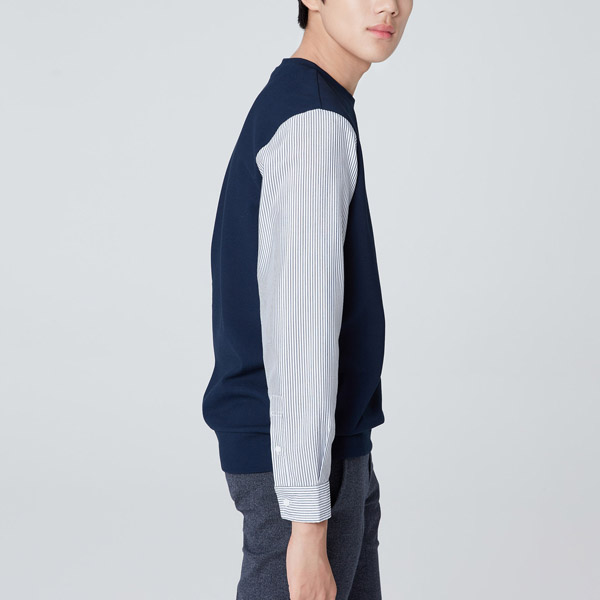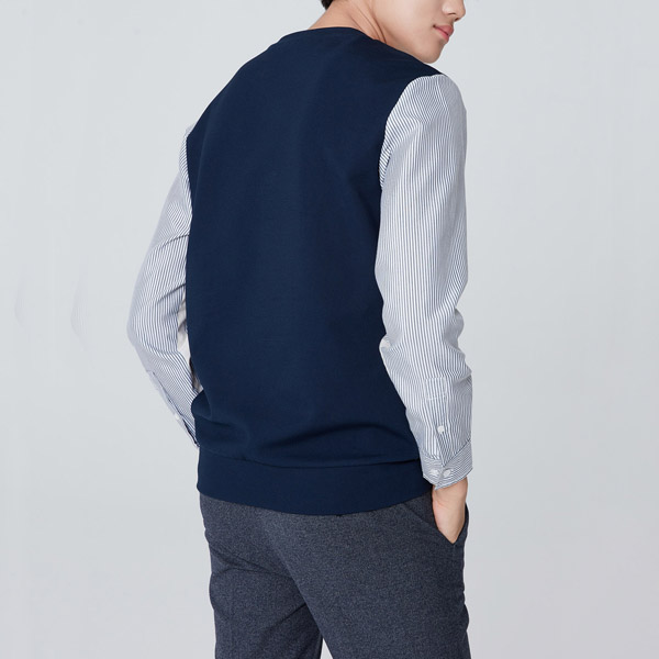 | 라운드 네크라인의 티셔츠와 스트라이프 셔츠를 레이어드한 디자인의 티셔츠입니다. 솔리드 컬러와 스트라이프 패턴 적용으로 세련된 스타일을 보여주며, 가벼운 터치감의 면 혼방 소재를 사용해 우수한 착장감을 전해줍니다. 다양한 하의 아이템과 코디 연출이 용이한 디자인입니다. | |