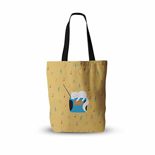 KESS InHouse Cristina Bianco Design "Sleeping Cat - Vintage Radio" Yellow White Illustration Everything Tote Bag, 13" x 13", Multicolor