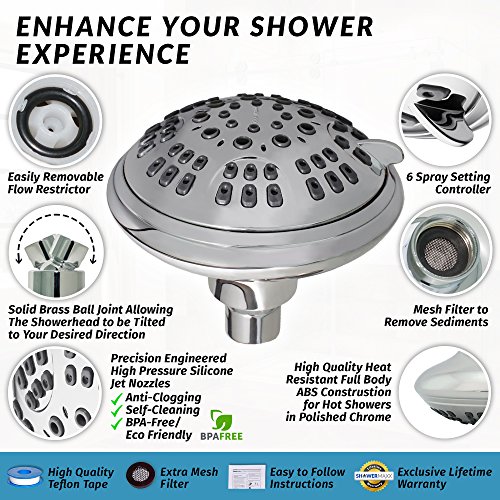 ►HIGH PRESSURE WATER FLOW – Effortlessly provides superior water pressure, 2.5 gpm water flow with removable flow restrictor and precision engineered high pressure silicone jet nozzles. Self-cleaning silicon jet nozzles with polished chrome finish ABS body, guarantees optimal performance even in low water pressure installations.